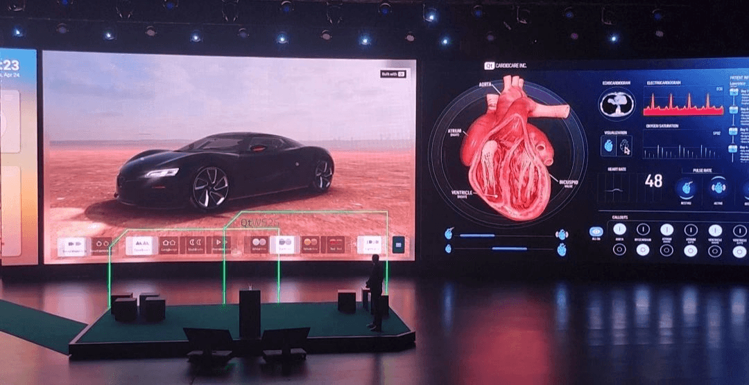 The experience had to blend 2D and 3D visuals, showcase newly introduced features in Qt 6.5, and remain performant on physical hardware for live conference demos. All design, asset preparation, and front-end implementation needed to be completed end-to-end within a three-week timeline.