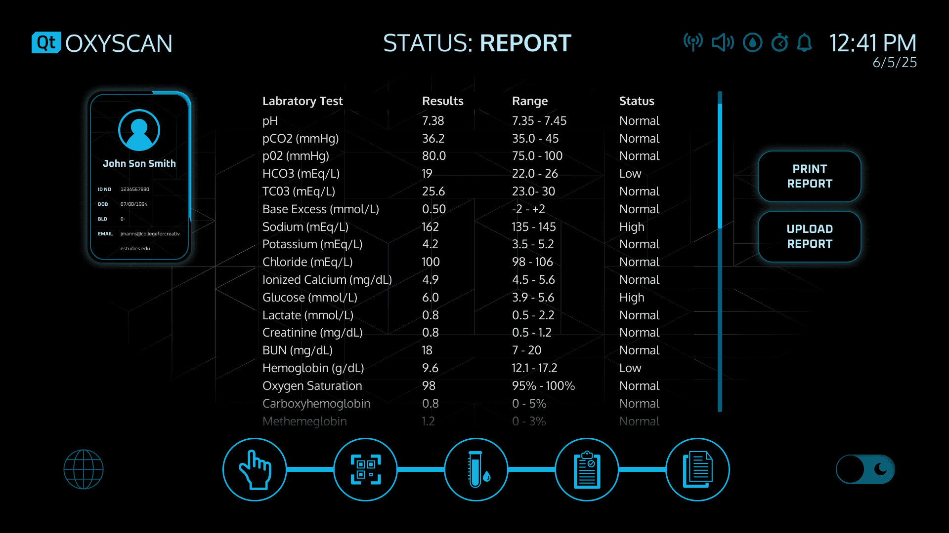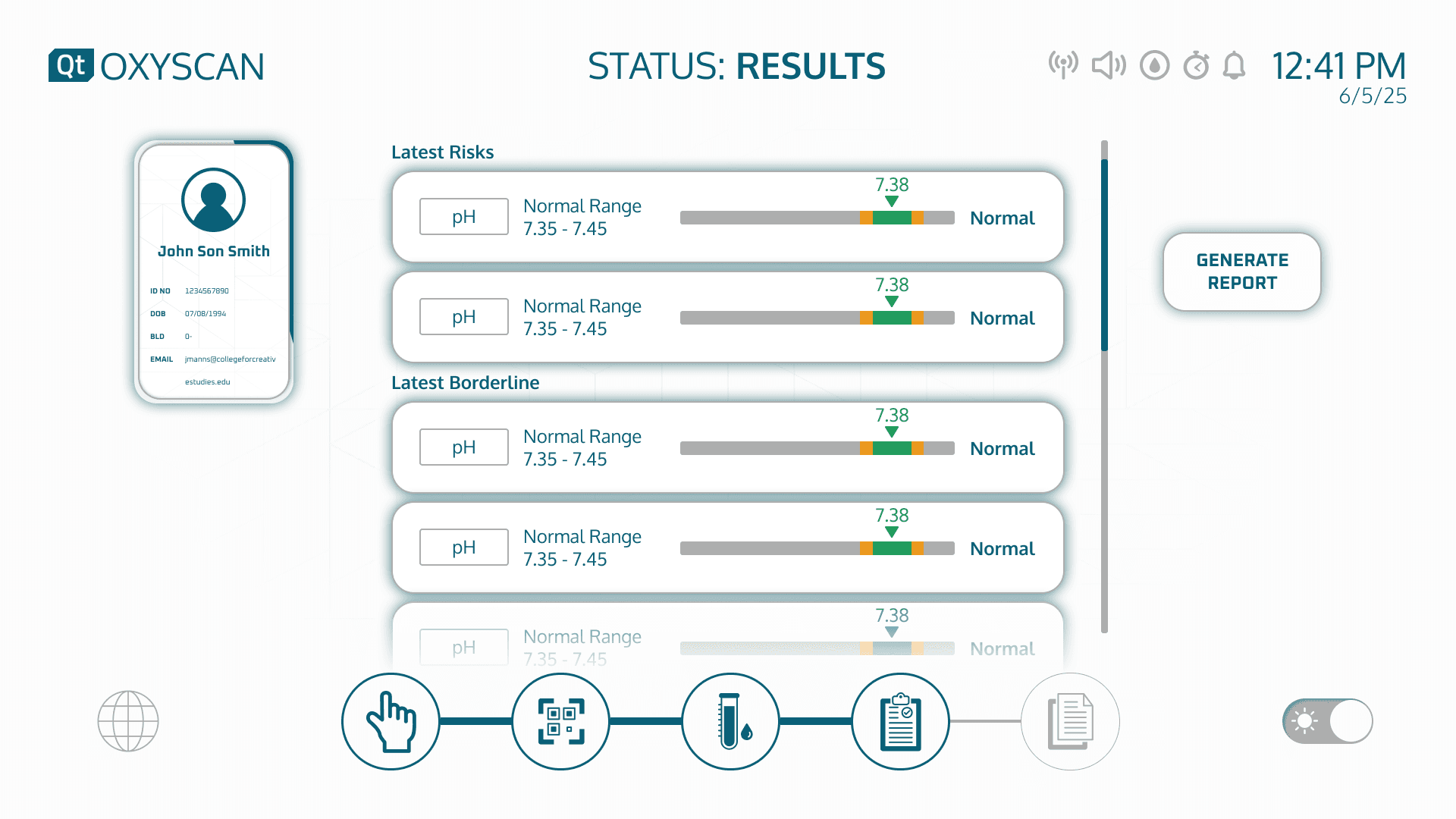 From the moment a sample is scanned, to the instant results shown on screen, OxyScan moves with intention. Navigation flows smoothly through stages of collection, processing, and analysis, supported by PathView-driven transitions and contextual feedback.