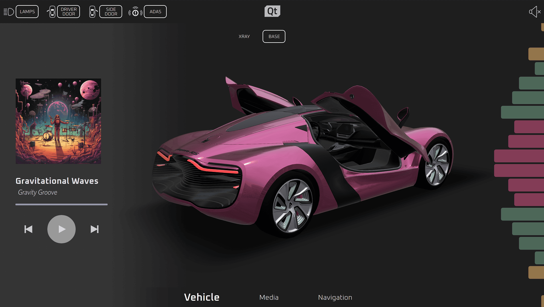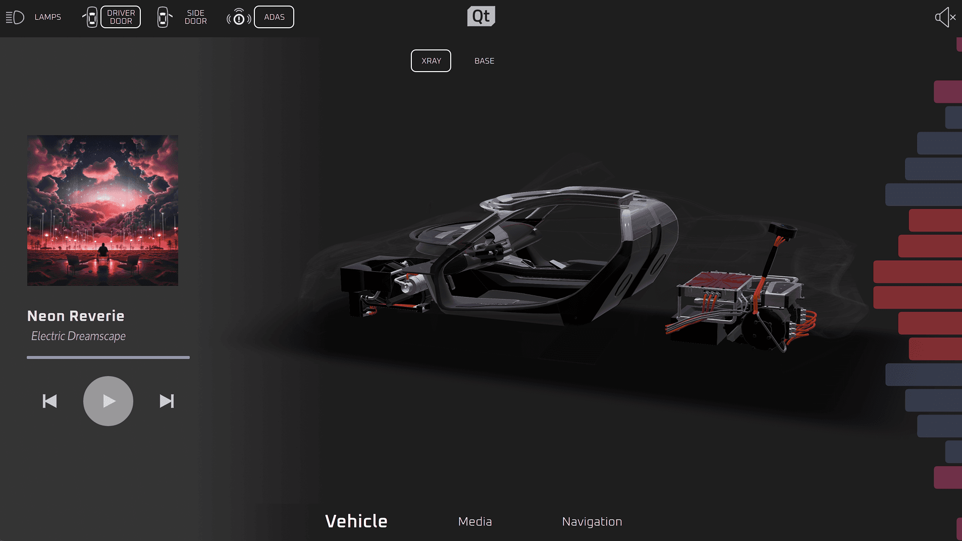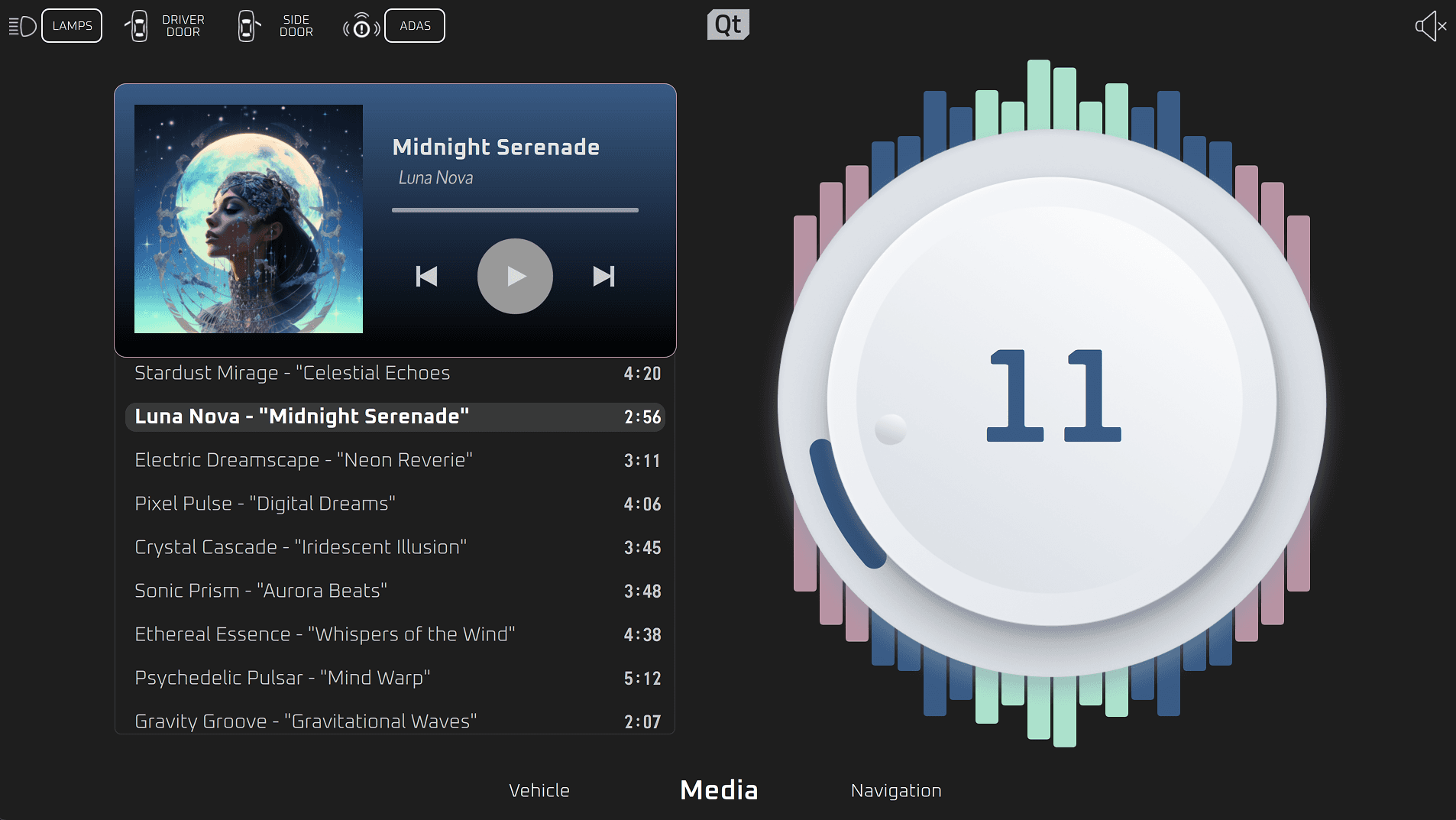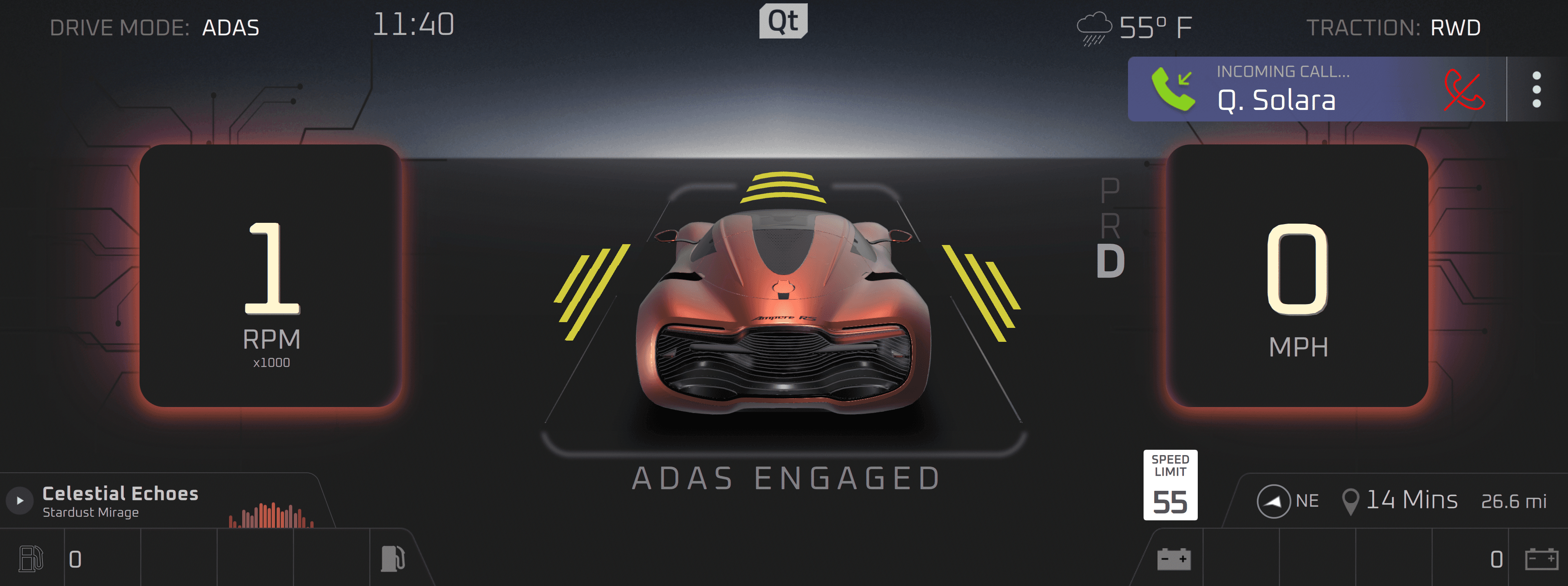 Rooted in a music-inspired theme engine, Antares transforms album artwork into dynamic visual identities. Each track introduces a new atmosphere, cascading color and style changes across both 2D interface elements and 3D vehicle paint surfaces in real time. The result is a cohesive, emotionally driven experience that demonstrates how modern theming systems can scale across an entire automotive UI without sacrificing performance, clarity, or control.